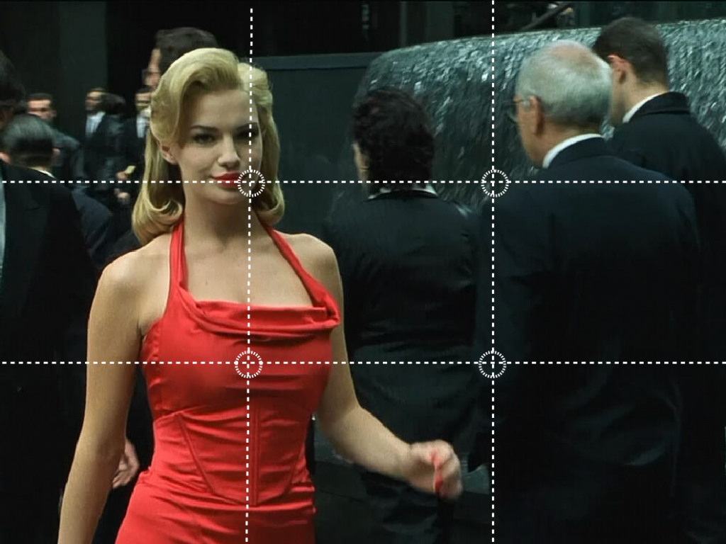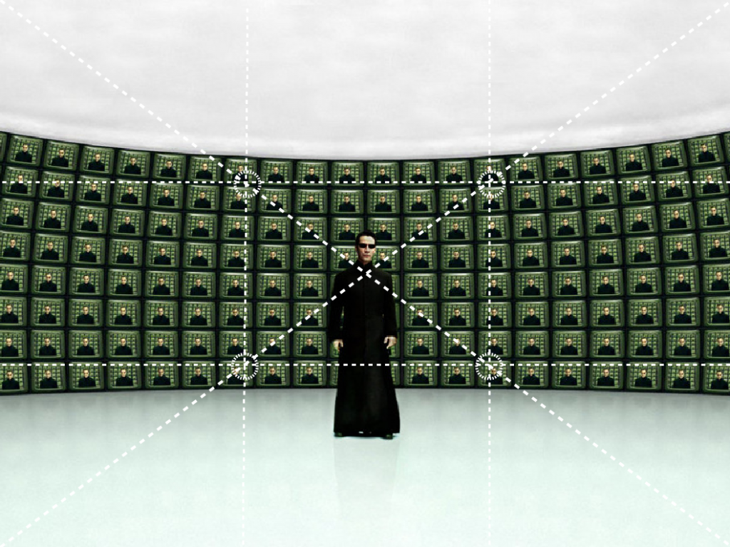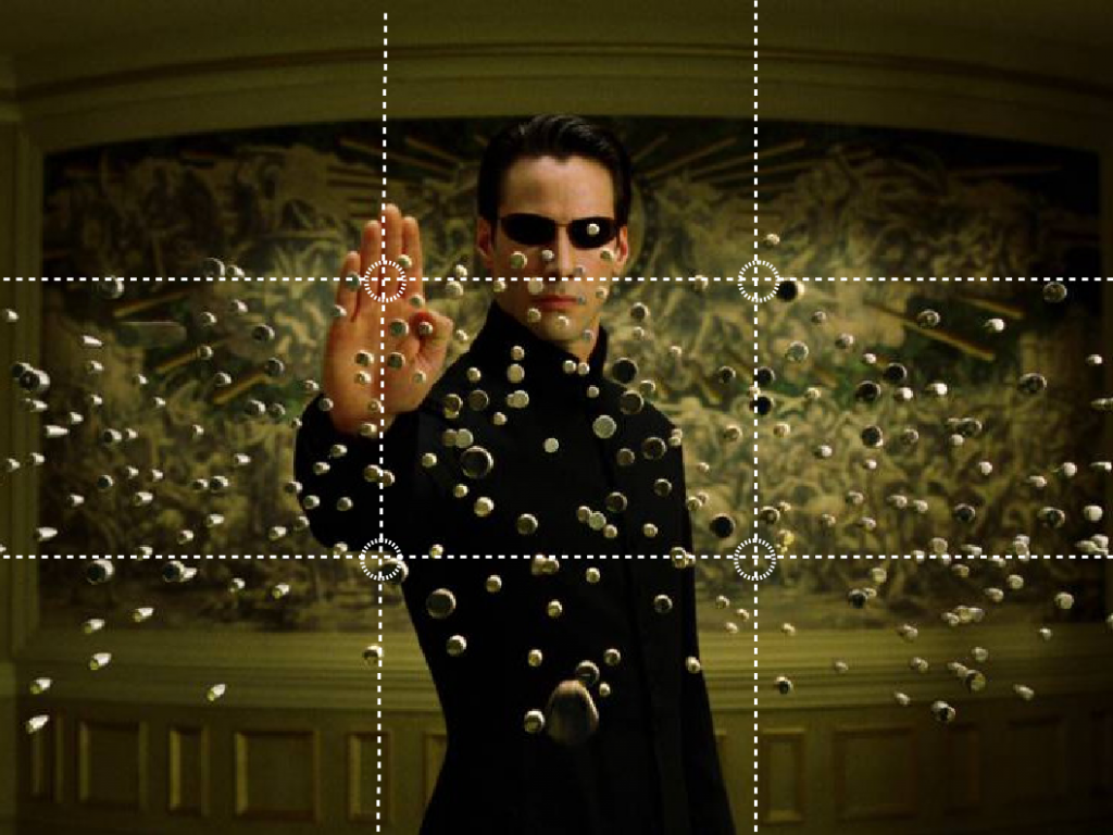 Si los elemento de la diapositiva (textos, gráficos, dibujos, imágenes, etc) están agrupados por conceptos y alineados, la audiencia podrá distinguirlos mejor, así que su interpretación será mucho más rápida. Por otra parte, la alineación ayuda a enfocar la atención en aquello que queremos resaltar. Existen muchos métodos de alineación de elementos que se aplican en pintura, fotografía y cine, pero el más común es la regla de los tercios. Según esa regla, las imágenes se dividen en tres tercios horizontales y tres verticales. Los elementos quedarían encuadrados en alguno de esos tercios. Fíjate en los ejemplos siguientes extraídos de la película Matrix (haz click para ampliar).