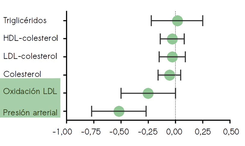 Solamente se ha publicado un meta-análisis de ensayos clínicos aleatorizados 2. Se publicó en el año 2015 y contenía 8 ensayos en humanos, en los que se comparaba AOV (rico en fenoles) con aceite oliva refinado (pobre en fenoles). Solamente se encontraron efectos significativos para la oxidación de LDL y la presión arterial y el efecto se consideró medio o bajo. Para el resto de parámetros estudiados relacionados con la enfermedad cardiovascular no se encontraron efectos significativos de la ingesta de AOV ricos en compuestos fenólicos. Por tanto, la conclusión fue que un AOV rico en compuestos fenólicos proporciona pequeños efectos beneficiosos sobre la presión sistólica y en el estatus oxidativo plasmático. Nada sobre triglicéridos, colesterol y HDL-colesterol y menos sobre la protección de los fenoles en eventos cardiovasculares (infartos, ictus o mortalidad por enfermedad cardiovascular). Aún así, sobre la base de estos ensayos, la Autoridad Europea de Seguridad Alimentaria (EFSA) acepta la alegación de que los polifenoles del aceite de oliva contribuyen a la protección de los lípidos sanguíneos del estres oxidativo. Pero atención, solo cuando se ingieren al menos 20 g de aceite de oliva que contengan al menos 5 mg de hidroxitirosol y sus derivados.