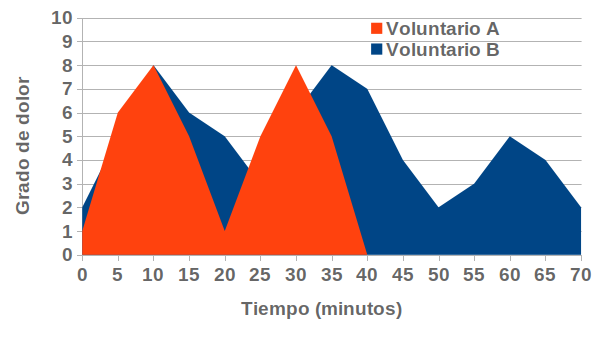 Parece evidente que el voluntario B (azul) ha sufrido mayor cantidad de dolor durante la colonoscopia porque alcanzó picos máximos de dolor de 8 puntos en la escala, igual que el voluntario A (rojo), pero durante más tiempo (70 minutos frente a 40 minutos). Por tanto, el área bajo la curva (la parte coloreada), que mide la cantidad de dolor, es mayor para el paciente B (azul) que para el A (rojo). Sin embargo, los investigadores se sorprendieron al encontrar que el paciente B refería haber sentido menos cantidad de dolor que el A. Según Redelmeier y Kahneman, esto se debe a que a la hora de recordar el dolor sufrido, las personas no tenemos en cuenta el factor tiempo, así que no estimamos el área bajo la curva, sino que damos mucha más importancia a los picos de dolor y al recuerdo que tenemos de éste. Puesto que el paciente A sufrió más dolor al final de su colonoscopia, tenía un peor recuerdo que el paciente B.