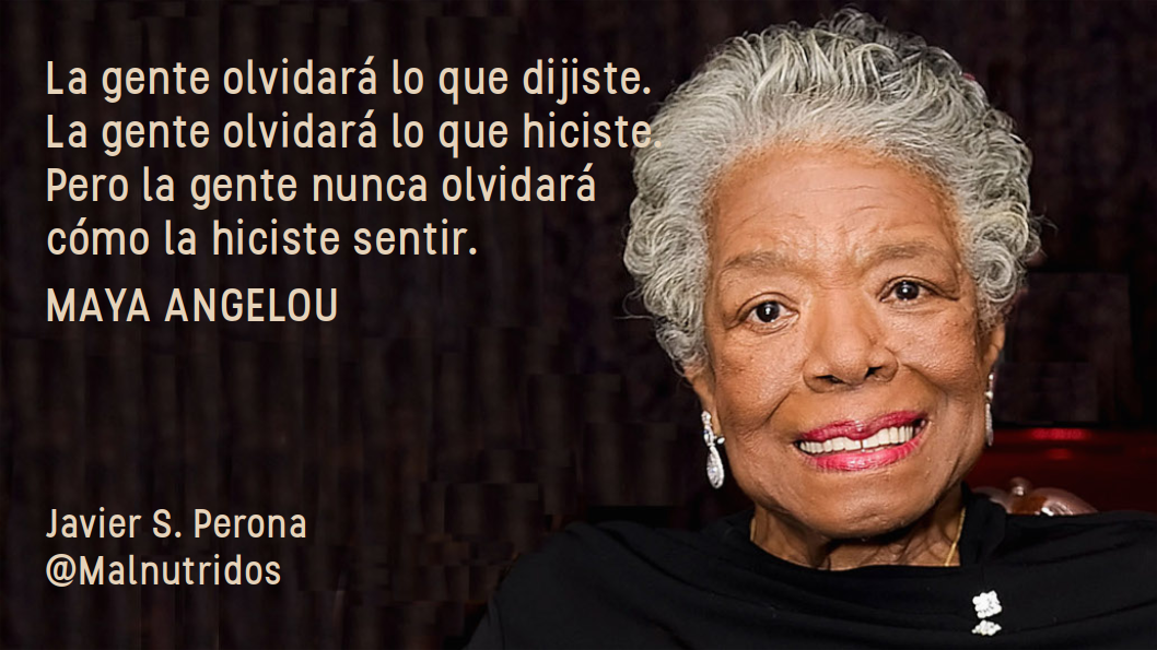 Por ejemplo, en las charlas que doy sobre el uso de las emociones en las presentaciones orales, suelo terminar con una cita de la escritora y activista estadounidense Maya Angelou. Es una cita que resume el contenido de mi charla y que deja un buen recuerdo. Maya Angelou decía que la gente olvidará lo que le dijiste, la gente olvidará lo que hiciste, pero la gente nunca olvidará cómo la hiciste sentir. Esta es la diapositiva que duelo usar.