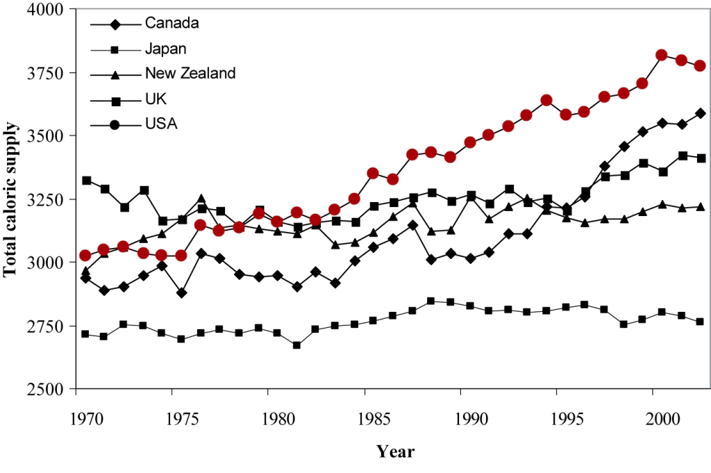 Como resultado de la investigación, los investigadores concluyeron que el incremento en la ingesta de calorías y no la reducción en la actividad física era el responsable de las tasas de obesidad en Estados Unidos. Evidentemente, reconocían la importancia del ejercicio físico para mantener un buen estado de salud y que la actividad se había ido reduciendo paulatinamente en la población pero era el incremento en la ingesta de alimentos el factor principal que había influido en el aumento de peso. Tras analizar los factores relacionados con la dieta que estaban detrás de este efecto, concluyeron que había dos mecanismos principales que impulsaban los aumentos en el suministro calórico: las innovaciones tecnológicas y los factores sociodemográficos. De entre ellos, los más influyentes eran los menores precios de los alimentos, la facilidad de las empresas para ingresar al mercado y la facilidad con la que las empresas pueden establecer sus propios precios. Además, estos investigadores y otros anteriormente, habían identificado la publicidad, el uso de la televisión y el acceso limitado a opciones de alimentos saludables como importantes factores también. Sin embargo, en 2008 aún no se hablaba de alimentos ultraprocesados.