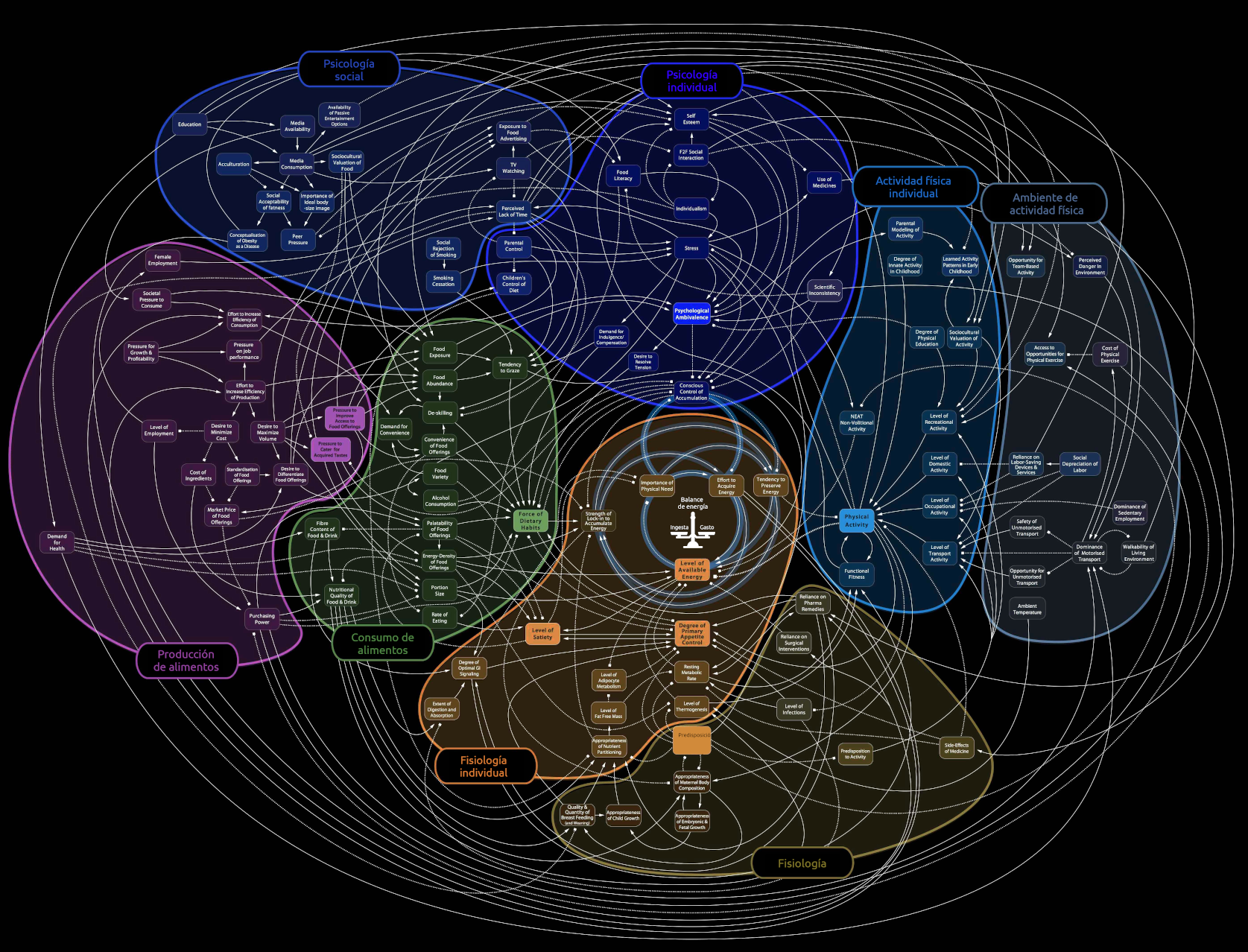 Aunque, como digo, los factores son múltiples (ver la imagen más abajo), al final, se reducen a dos grandes grupos: los que afectan al gasto energético y los que afectan a la ingesta energética. Los primeros son los que tienen que ver con la actividad física y el sedentarismo y los segundos con la dieta. Por supuesto, que dentro de estos grupos hay muchos factores, como los del individuo, pero también los del entorno, incluidos factores socioeconómicos.