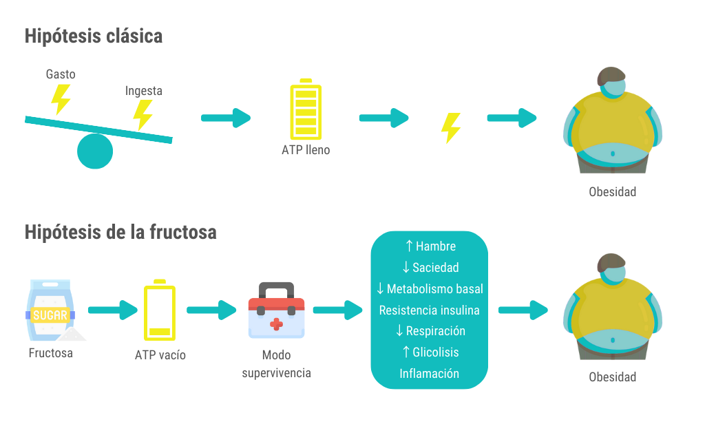 La hipótesis de la supervivencia a la fructosa ha surgido como un intrigante mecanismo que podría explicar el desarrollo de la obesidad. El consumo de fructosa podría inducir un estado de déficit energético al reducir los niveles de ATP en las células. Esta teoría sugiere que este mecanismo se habría desarrollado para ayudar a los animales a acumular grasa cuando la comida estaba disponible, anticipando una futura escasez. Sin embargo, en la actualidad, el consumo crónico excesivo de fructosa podría convertir este mecanismo beneficioso en la causa de la obesidad y de las enfermedades asociadas.