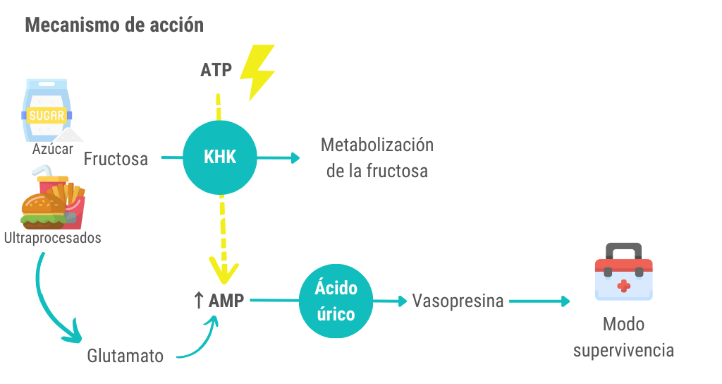 En este escenario de déficit de ATP provocado por el exceso de fructosa, la célula entra en “modo supervivencia”, ya que considera que está en una época en el que la comida está mínimamente disponible. Aunque el propósito de este mecanismo es ayudar a la supervivencia, en nuestro entorno obesogénico, en el que se ingiere un exceso de fructosa procedente de alimentos ultraprocesados, la respuesta de supervivencia puede conducir a la obesidad.
