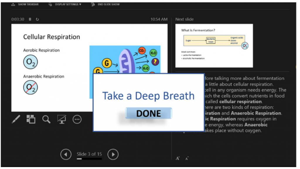 Investigadores de la Universidad del Nordeste, en Boston, EEUU, propusieron un sistema para recordar al orador de la necesidad de respirar profundamente o hacer pausas durante las presentaciones 3. Para eso, incluyeron un software en PowerPoint, que provocaba la aparición de una ventana cada vez que el ponente avanzaba de diapositiva cuando estaba en “modo presentador”. En la mayoría de los casos, los participantes manifestaron que las respiraciones profundas les ayudaban a calmarse y las pausas les recordaban que podían respirar con tranquilidad sin que eso mermara su actuación. En cualquier caso, también afirmaron que las respiraciones profundas después de cada diapositiva les despistaban un poco y entorpecían el hilo del discurso.